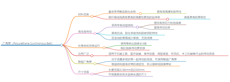 廣角帶(Polyurethane Synchronous Belt)是一種廣泛應用于高扭矩傳動系統中的傳動帶。它具有以下特點: