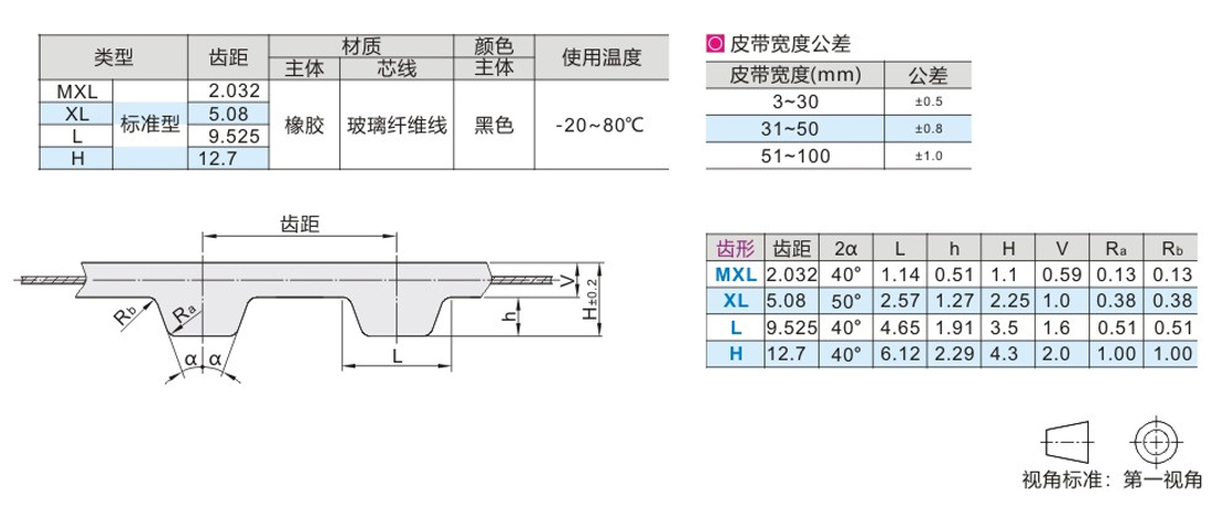梯形齒同步帶可分為多個型號,其中包括MXL、XL、L和H型。